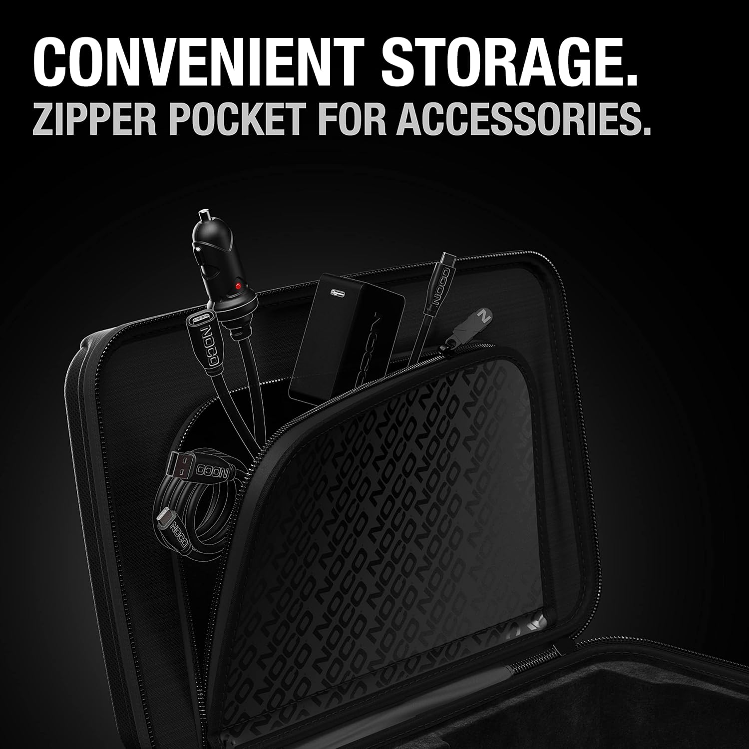 NOCO GBC104 הוא נרתיק מגן קשיח בעיצוב חצי־קשיח עשוי חומר EVA איכותי, שנועד להגן על בוסטר ההתנעה NOCO Boost X GBX155 מפני לחות, פגיעות, אבק וגורמים סביבתיים אחרים. הנרתיק כולל סגירת רוכסן מחוזקת, ידית נשיאה קשיחה ותא פנימי מותאם בדיוק לצורת המכשיר.