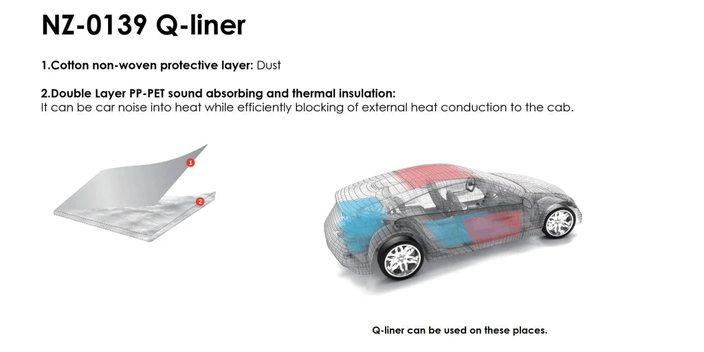 NAKAMICHI NZ-0139 Q-Liner הוא חומר בידוד אקוסטי מבד לבן, המשלב טכנולוגיית ספיגת רעשים עם שכבות בידוד תרמי – להפחתת רעשי דרך, שיפור איכות השמע ומניעת חדירת חום לתא הנוסעים.